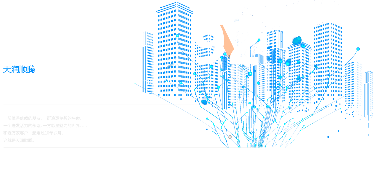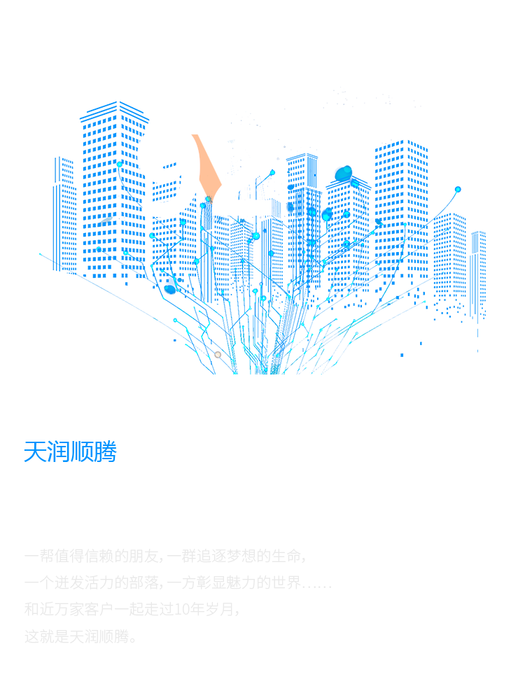 一幫值得信賴(lài)的朋友,一群追逐夢(mèng)想的生命, 一個(gè)迸發(fā)活力的部落,一方彰顯魅力的世界…… 和近萬(wàn)家客戶(hù)一起走過(guò)10年歲月, 這就是天潤(rùn)順騰。